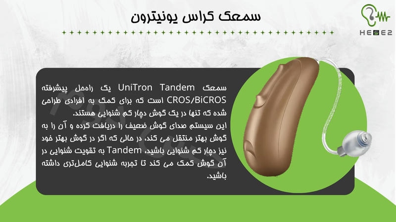 سمعک UniTron Tandem یک راهحل پیشرفته CROS/BiCROS است که برای کمک به افرادی طراحی شده که تنها در یک گوش دچار کم شنوایی هستند. این سیستم صدای گوش ضعیف را دریافت کرده و آن را به گوش بهتر منتقل می کند، در حالی که اگر در گوش بهتر خود نیز دچار کم شنوایی باشید، Tandem به تقویت شنوایی در آن گوش کمک می کند تا تجربه شنوایی کاملتری داشته باشید.
