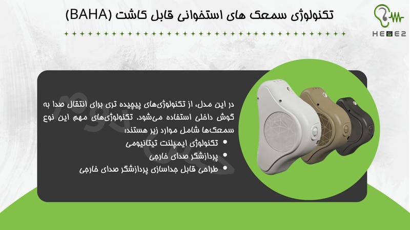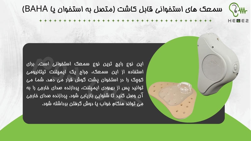سمعک های BAHA (Bone Anchored Hearing Aids): این سمعک ها به طور جراحی در استخوان جمجمه کاشته می شوند. این دستگاه ها شامل یک ایمپلنت تیتانیومی هستند که در استخوان پشت گوش قرار می گیرد و پس از بهبودی، پردازشگر صدا به آن متصل می شود تا صدا را از طریق استخوان منتقل کند.